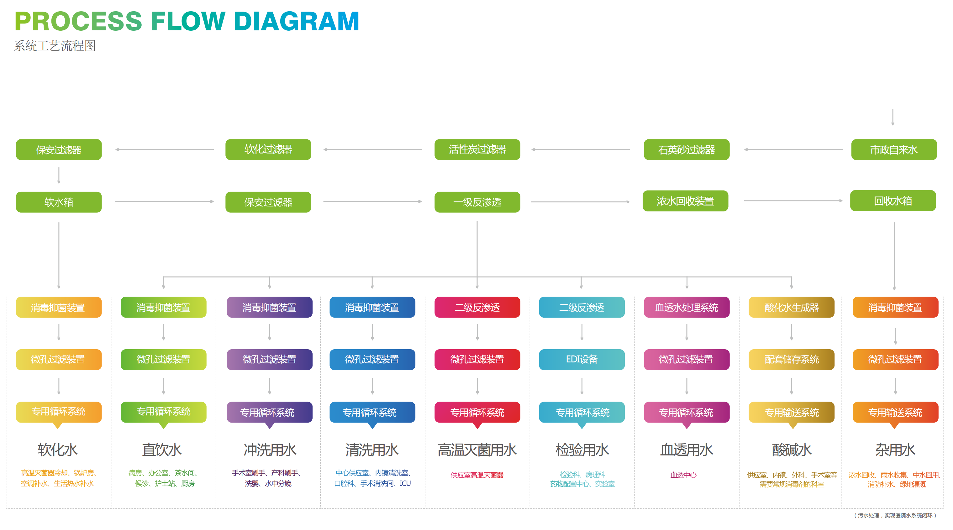 系統(tǒng)主機(jī)房設(shè)置在地下室,釋放了大量醫(yī)療面積,也避免了水處理設(shè)備噪音對醫(yī)療區(qū)域的影響。系統(tǒng)通過集成優(yōu)化設(shè)計(jì),濃水回收等技術(shù)使用,能夠降低30%-50%的水電能耗。